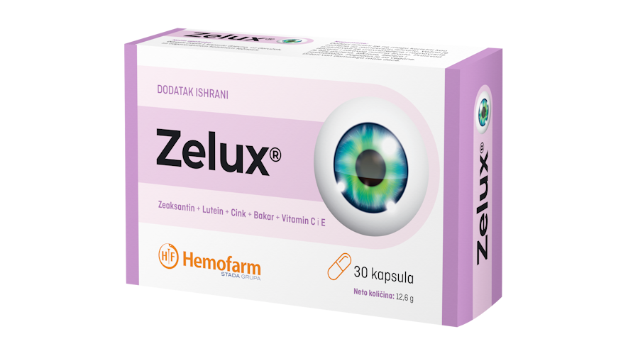 Zelux je dodatak ishrani koji je namenjen očuvanju zdravlja očiju i održavanju normalnog vida. Zbog svog izbalansiranog sastava koji sadrži makularne pigmente zeaksantin, lutein kao i vitamine A, C, bakar i cink ostvaruje snažan antioksidativni efekat i usporava razvoj senilne degeneracije i slabljenje vida. Način upotrebe: dijetetski suplement namenjen je za odraslu populaciju i primenjuje se jedna kapsula dnevno, uz doručak, sa dosta tečnosti.