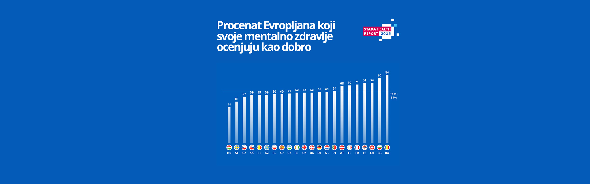 Mentalno zdravlje postaje jedan od ključnih zdravstvenih izazova savremenog društva u Evropi, pokazuje ŠTADA Zdravstveni izveštaj za 2025. godinu. Iako se svest o mentalnom zdravlju povećava, podrška i dalje ostaje nedostupna za milione građana, a digitalne navike dodatno komplikuju svakodnevni stres. Prema rezultatima istraživanja, 64% Evropljana ocenjuje svoje mentalno zdravlje kao „dobro“, što predstavlja nastavak blagog ali stabilnog opadanja u odnosu na prethodne godine (65% u 2024. i 67% u 2023.). Istovremeno, 36% građana ima probleme sa mentalnim zdravljem, a 9% ga ocenjuje kao „loše“ ili „veoma loše“. Glavni pokretači stresa duboko su ukorenjeni u svakodnevnom životu, tako da se finansijske brige (26%) i stres na poslu (24%) izdvajaju se kao dominantni faktori. Srbija se, sa 74% građana koji svoje mentalno zdravlje ocenjuju kao dobro, nalazi među prvih pet evropskih zemalja, rame uz rame sa Švajcarskom, a odmah iza Rumunije (84%) i Bugarske (80%).